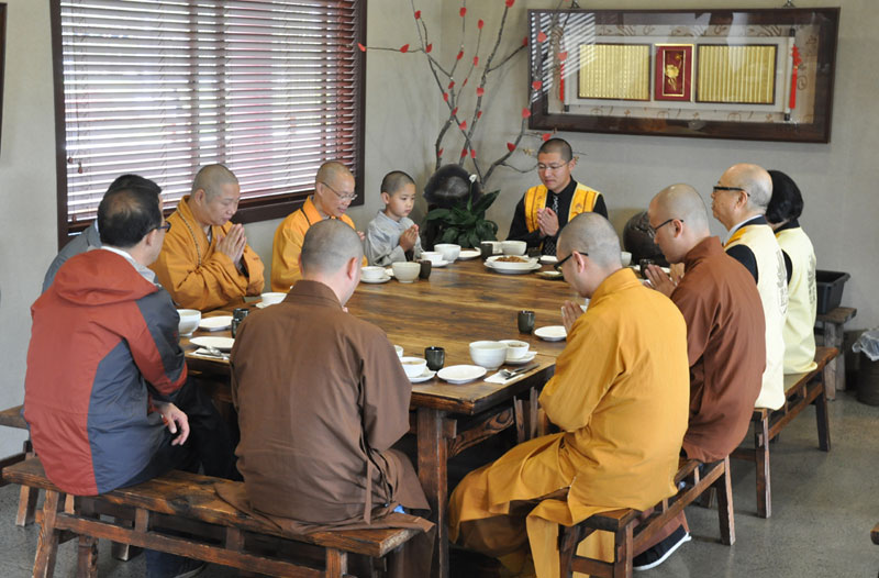 寺院巡禮後,住持於滴水坊以素齋款待允觀法師等貴賓,並在茶敘中交換紐西蘭與中國大陸弘法的經驗、北島佛光山寺與國清寺的歷史等,並互贈結緣品留念。