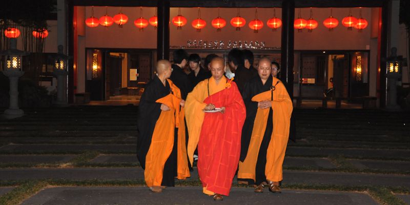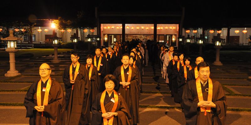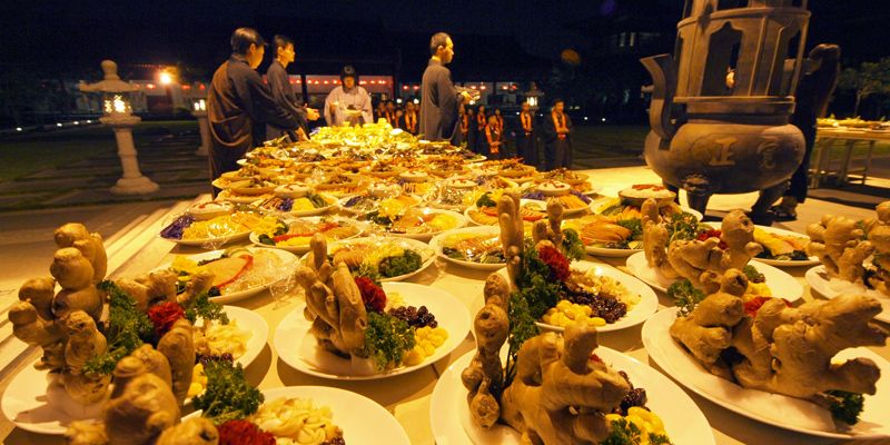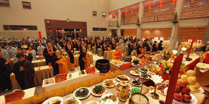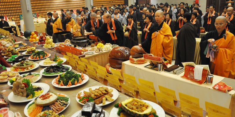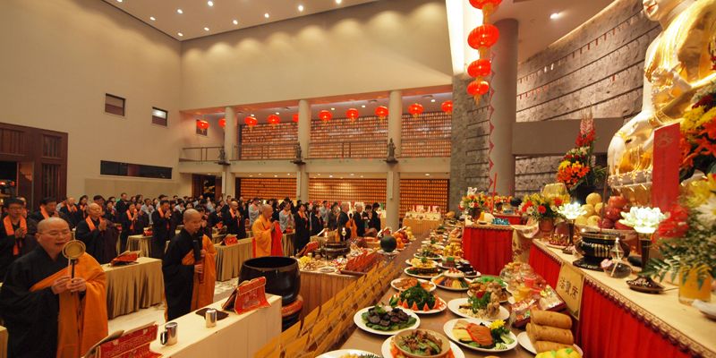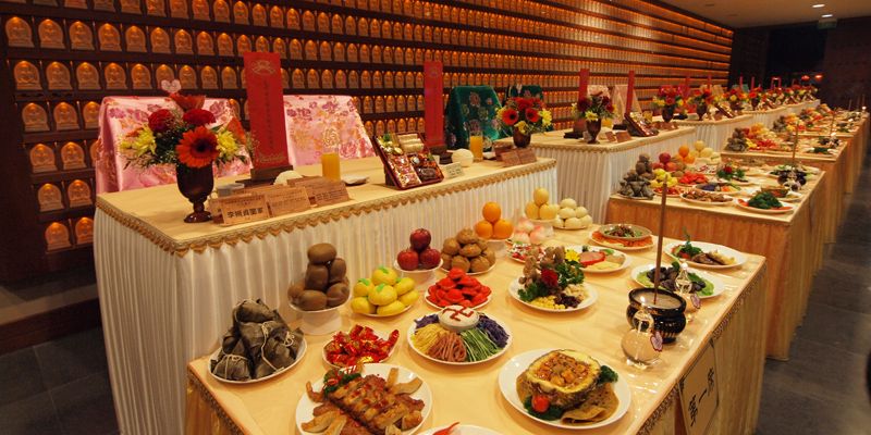 雖然法會臨近午夜,信眾們卻依然精神抖擻,整個道場籠罩在一片歡欣祥和的佛海聲中;莊嚴的獻供隊伍井然有序地獻上義工們精心準備的素齋,有中國菜、印度菜、韓國菜、日本菜、山珍海味等九道菜品,盤盤獨具一格、造型別致,可謂色香味俱全,充分表達信眾們致誠的供養心,透過辦桌請聖來培植福德、增長慈悲。