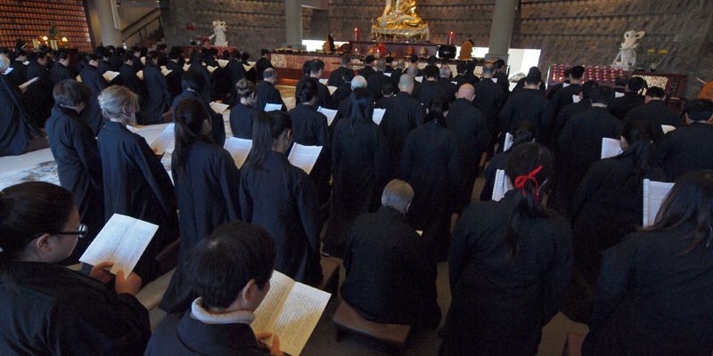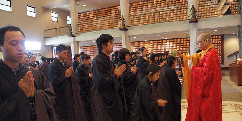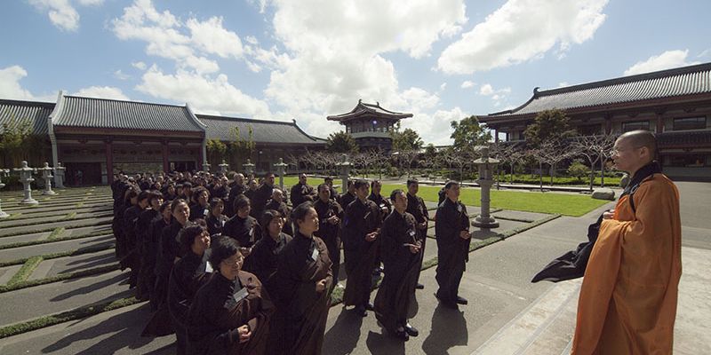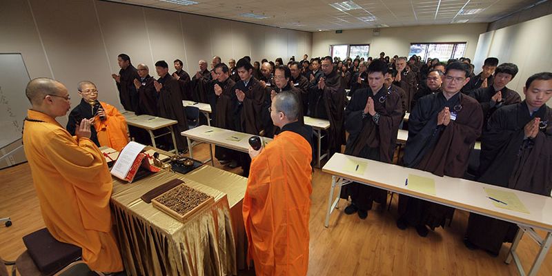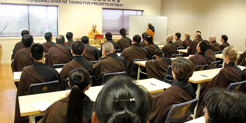 紐西蘭北島佛光山於9月22日舉行五戒戒會,110餘位新戒、複戒戒子在引禮法師及班首代表迎請下,恭迎主法和尚紐西蘭佛光山住持滿信法師帶領戒子們在佛前自願發心受持五戒。會場內莊嚴肅穆,戒子們誠心懺悔無始劫以來所作諸惡業,從四弘誓願中明白每一期生命從度眾、斷煩惱、學佛及行佛的重要。