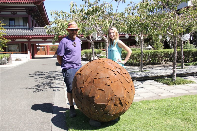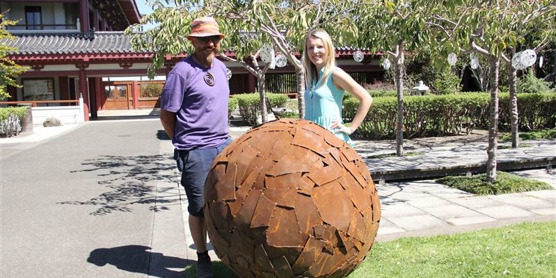 成佛大道的草坪上,James的作品「Piwakawaka’s World」又是一尊醒目之作,耐候鋼與青銅所製的空心球頂,站立著一隻紐西蘭最常見的鳥Pwakawaka,球體代表周圍的世界,它悉心觀察著周遭環境,讓人感受到它敏銳的洞察力和高度的警覺性。