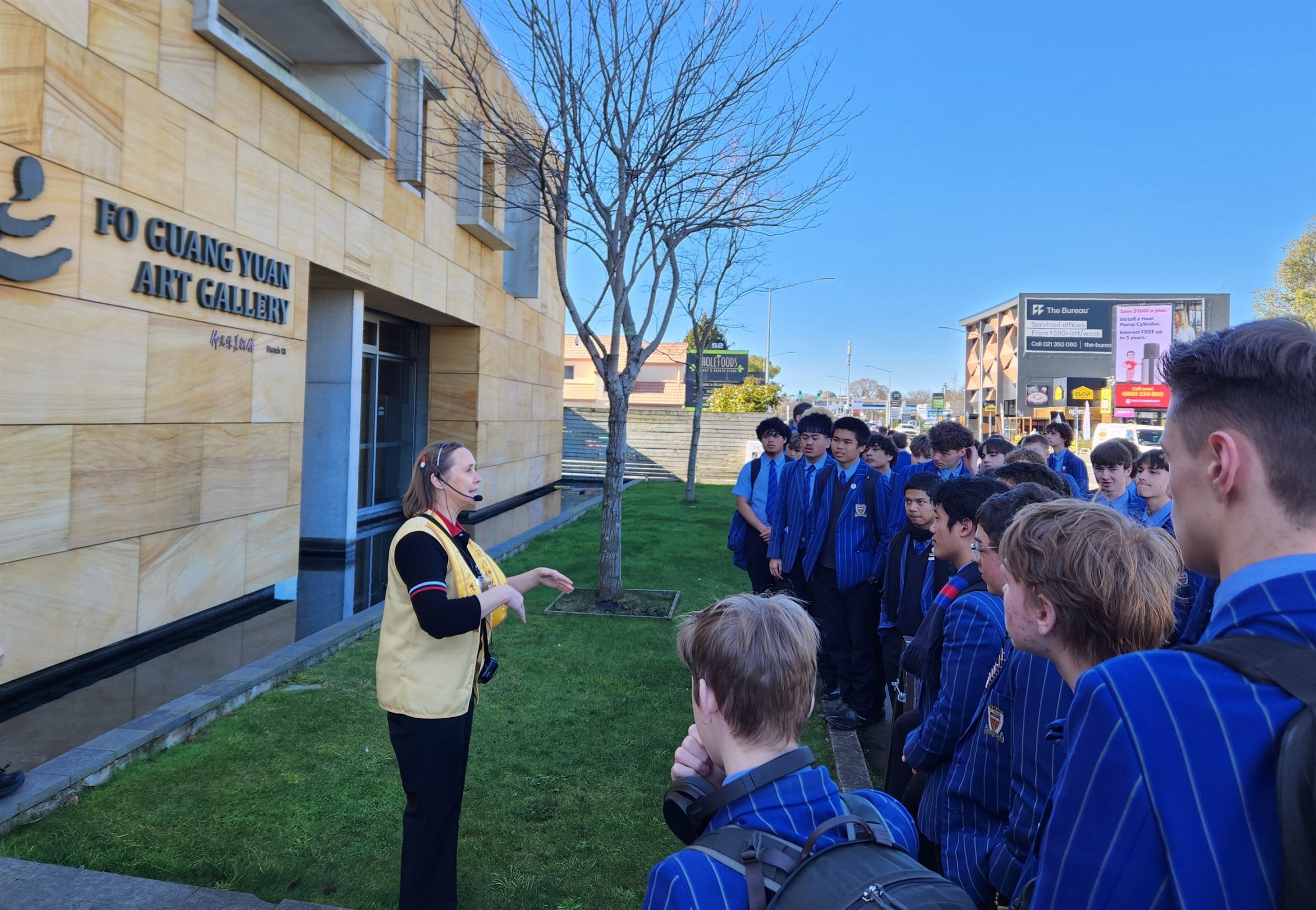 師生們在國際佛光會紐西蘭南島協會幹部Deirdre Johns的帶領下進行寺院巡禮,欣賞佛光緣美術館紐西蘭二館的「Harmony & Hue」油畫展。常住法師帶領學生觀賞《佛陀的一生》影片、進行太極操、體驗靜坐及學習人間佛教「三好四給」理念。